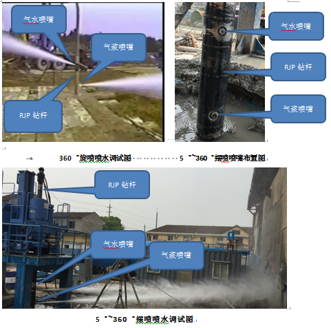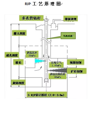 使用高壓氣水(氣包水、氣水同心)預切割、疏松、攪拌,再用超高壓氣漿(氣包漿、氣漿同心)再切割、疏松、攪拌,從而達到更大的直徑、更好攪拌效果的水泥土攪拌樁,置換的泥漿通過鉆桿同孔壁的空隙在氣托作用下自然泛漿到地面。